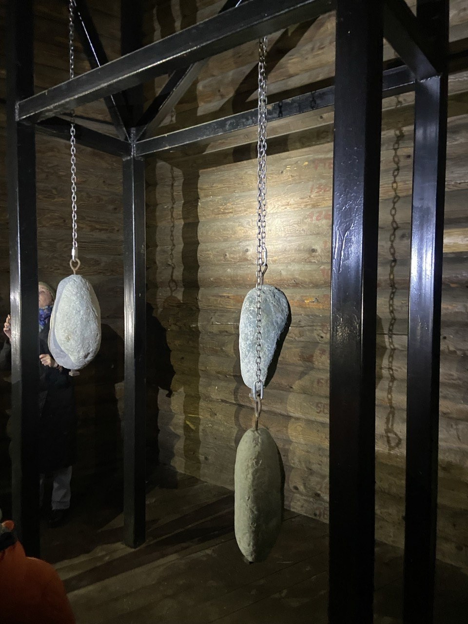И вот тут мы окунулись в самОЮ историю часов на Часовой башне Кремля. На фото гири, которые подвешивали и они спускались на дно башни, а она более 30 метров, механизм определял по движению шестерёнок время и в колокол ударял специальный молот — бой. Видеть часы необязательно, главное слышать бой. Поэтому в городе и были одни единственные часы на высокой часомерье, т. е. часовой башне!